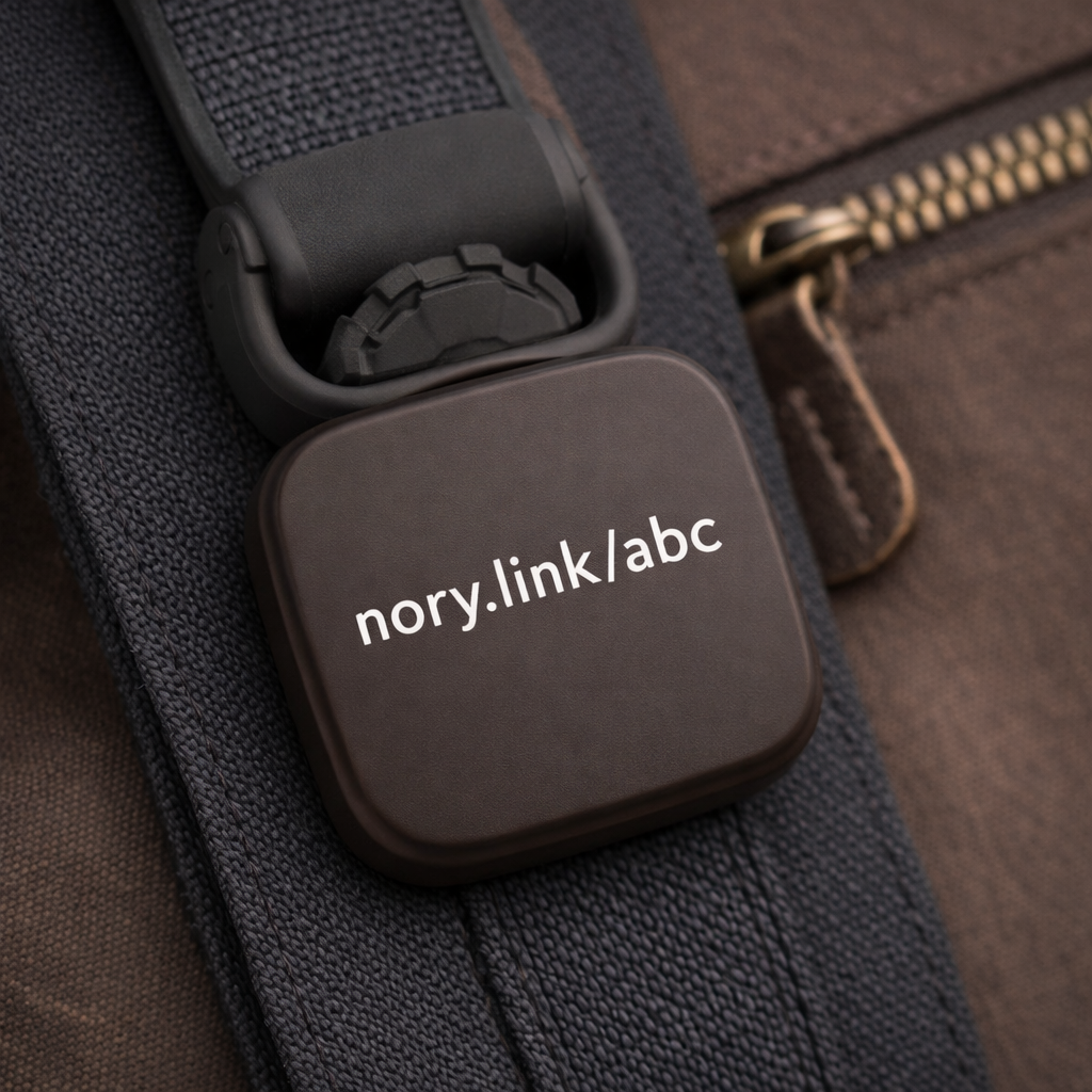 Nory is a small wearable tag that links to a personal page you control. People don't scan it. They don't need an app. They simply notice it and visit the link. What you share about yourself is up to you.